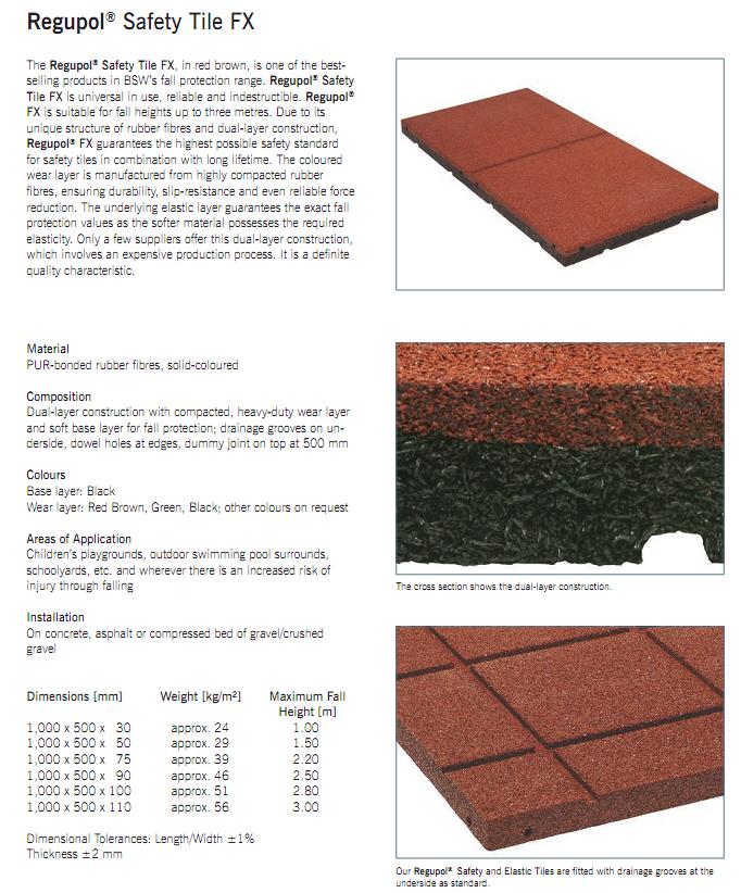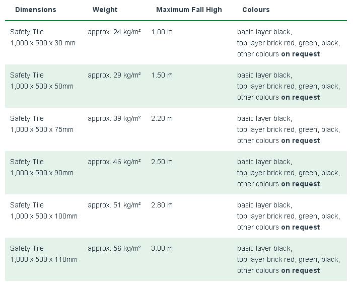 Dale masive din cauciuc cu grosimi de 30 mm pana la 110 mm, ce garanteaza protectia la cadere de la inaltimi de peste 3 m (Regupol ® Impact 110 mm). In atasament se pot regasii inaltimea maxima de cadere la cere se asigura protectie, in functie de grosimea dalelor din cauciuc. Date conform studiiilor si cercetarilor din Laboratoarele din Germania. Testele se pot pune la dispozitie, la cerere.